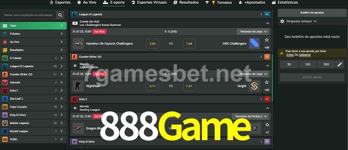 O 888Game oferece uma grande seleção de opções de apostas em e-sports com probabilidades competitivas